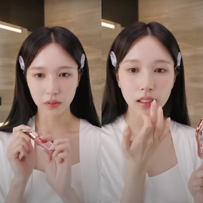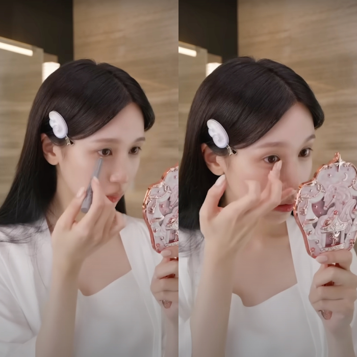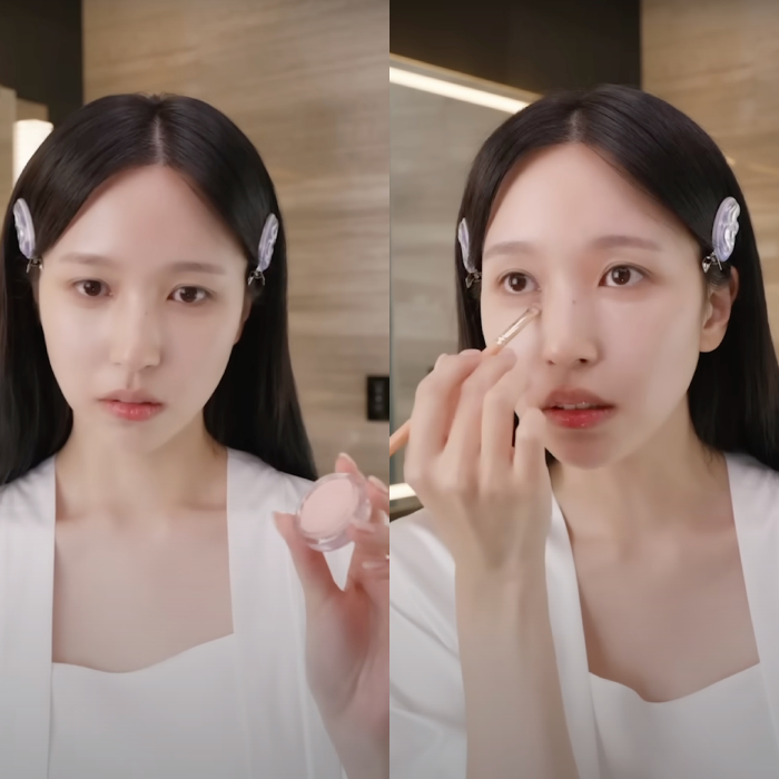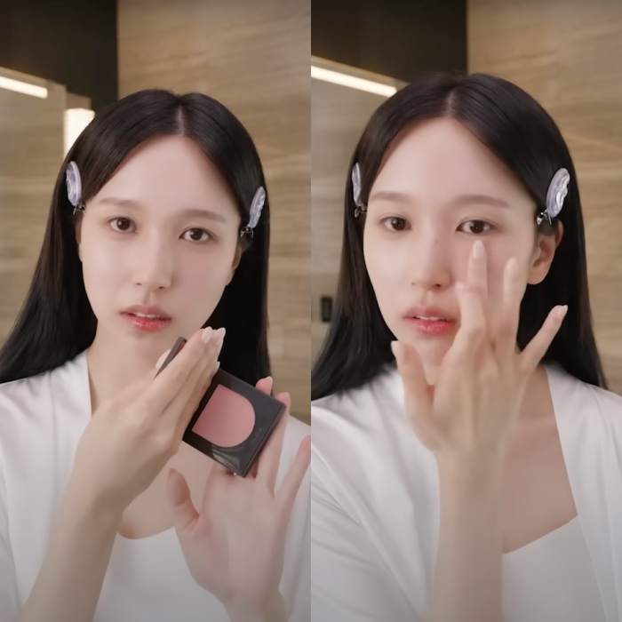 Mina adds a soft flush to her cheeks with the NUEGRAY Sway Cheek Blusher 5 (~S$24.40). As a pigmented cream blush, she carefully taps it with her finger and blends it along the apples of her cheeks, nose tip, and chin.