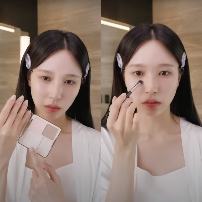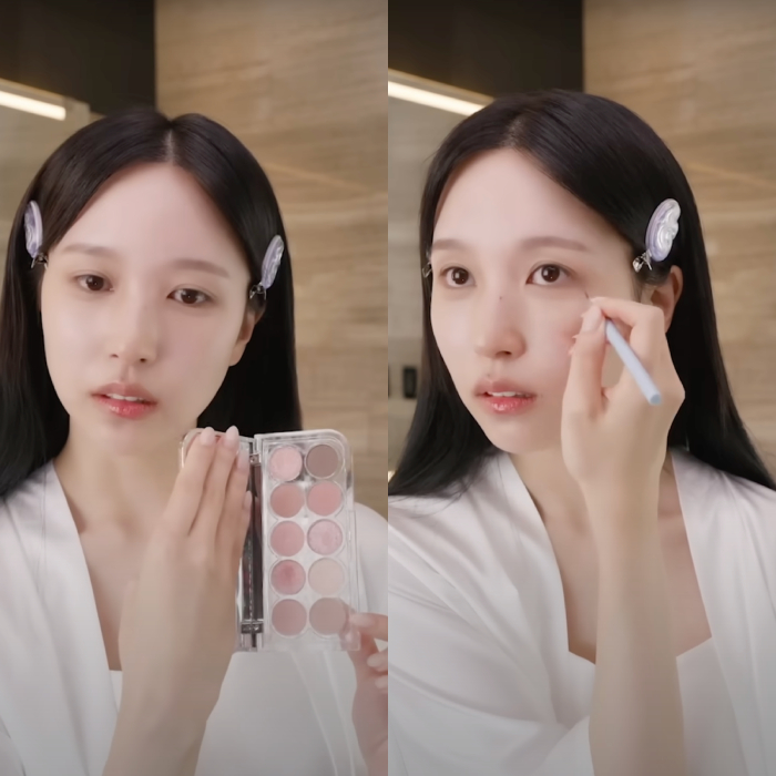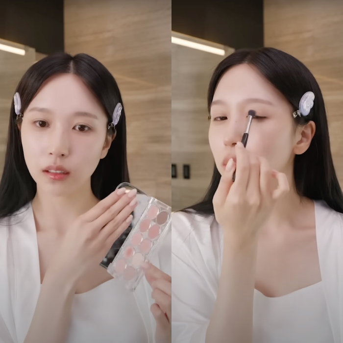 Using the Lummir Light On Eyes Shadow Palette 05 (S$47.25), she dabs a light beige shade and blends it along her eyelids. Mina comments that she always goes for beige-pink shades to add a touch of softness to her eyes.