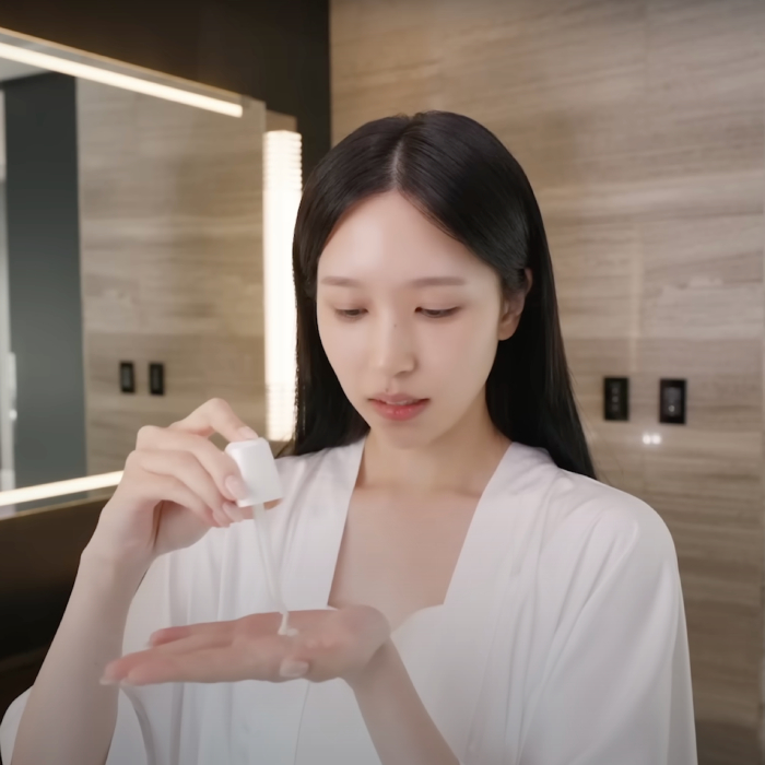 Mina has been a fan of this for a few years now. She loves its light and watery texture, which instantly refreshes her skin. She takes her time applying two layers of the essence, enjoying the moment as part of her skincare routine.