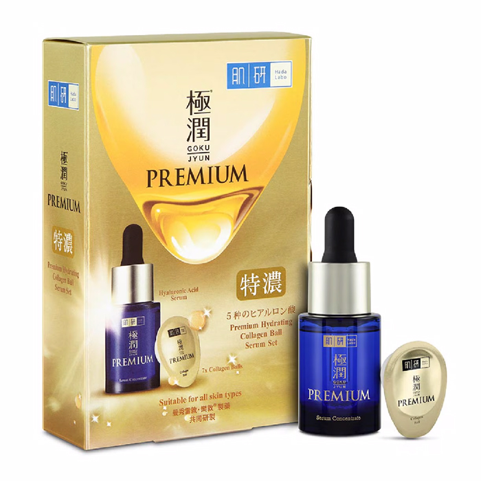 The Hada Labo Premium Hydrating Collagen Ball Serum Packset?combines hyaluronic acid and collagen to hydrate,?firm,?and smooth your skin.?The collagen balls are concentrated capsules that can be easily used to improve skin elasticity.