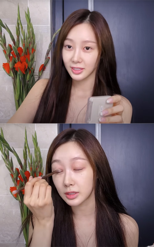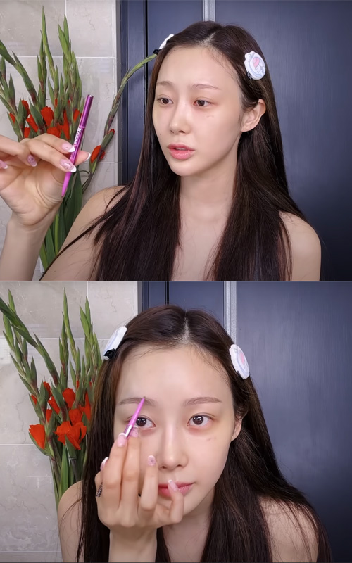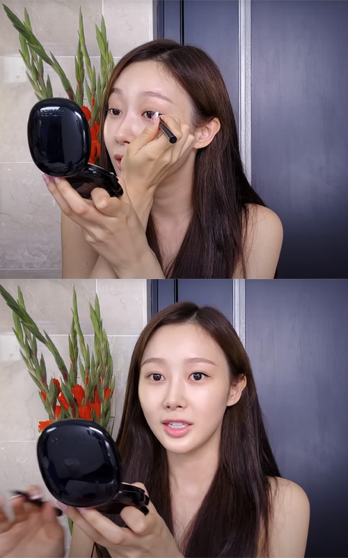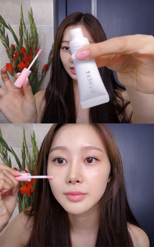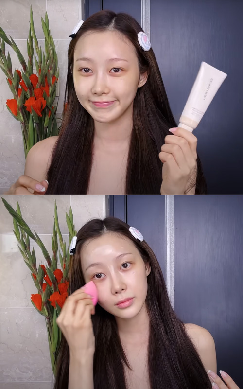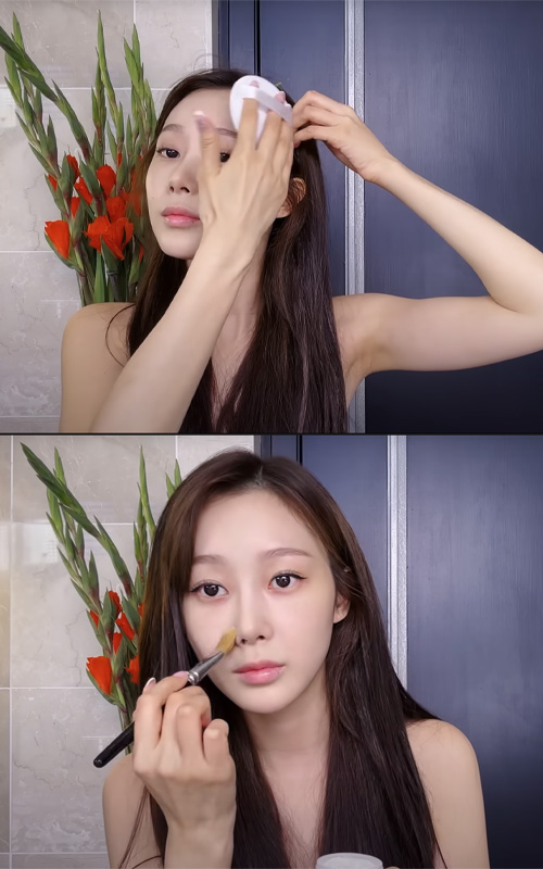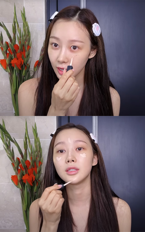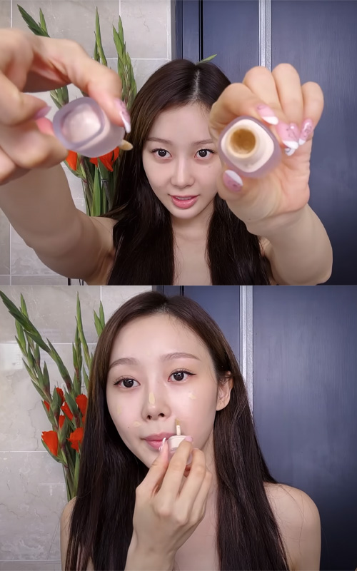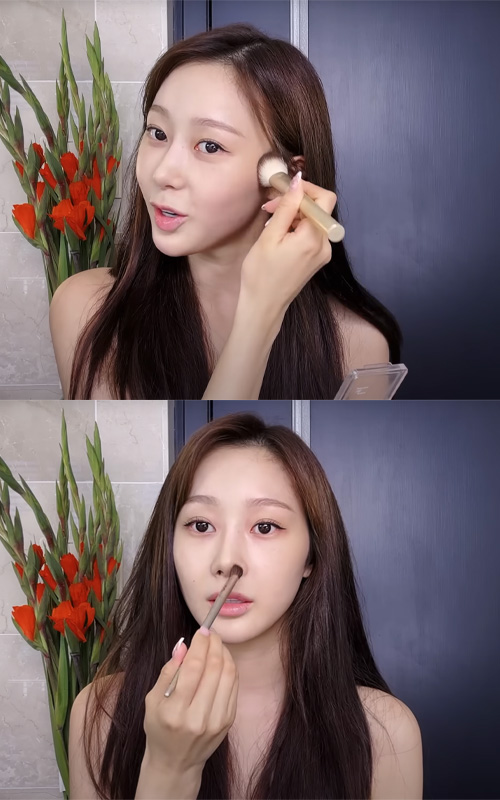 She applies it with a brush for precise placement, then gently dabs it in with her fingers and a beauty blender so it melts naturally into the skin. It’s a simple product she picked up online, but it does the job well in her routine.