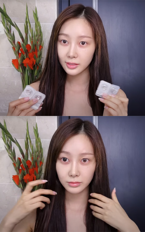 Before diving into eye makeup, Giselle makes a quick pit stop to choose her contact lenses – a step that, for her, changes her look just as much as makeup does.