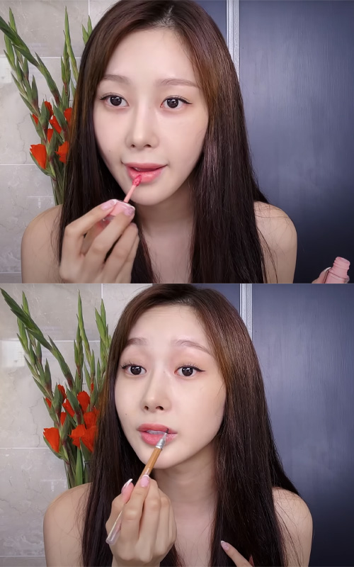 For lips, Giselle starts with the Either& Dewy Syrup Tint in Melt Away (S$17.28), applying the colour before blending it out with a lip brush to keep the finish smooth and clump-free.