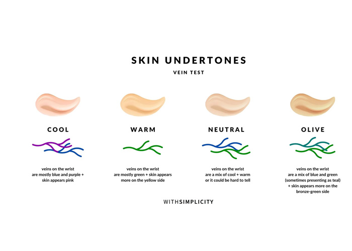 Not sure where you fall on the undertone spectrum? It’s simpler than you think. Start by checking the veins on your wrist: blue or purple means cool, greenish points to warm, teal or green-grey hints at olive, and if you can’t quite tell, you’re probably neutral.