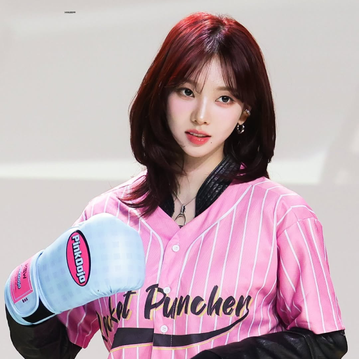 Confident in her fiery hues, Yunjin has experimented with all sorts of shades and tones, including a sultry wine red shade. The cooler tones instantly lift and brighten her face, paired with face-framing curtain bangs.
