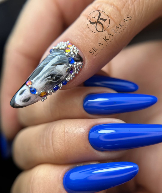 The remaining nails are painted royal blue to create a rich, luxurious feel. To make the set even more captivating, you can add subtle gold stripes, tiny star studs, or a soft glitter gradient to a few nails, keeping the focus on the horse while making the whole look pop.