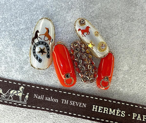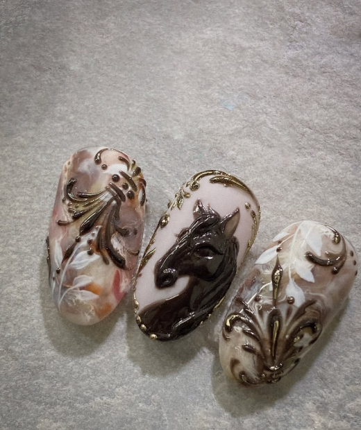 Think rich brown tones, regal details, and horse-inspired accents that feel straight out of a modern-day palace. This nail look gives off classy, royal energy without trying too hard, perfect if you love something elegant with a subtle statement.