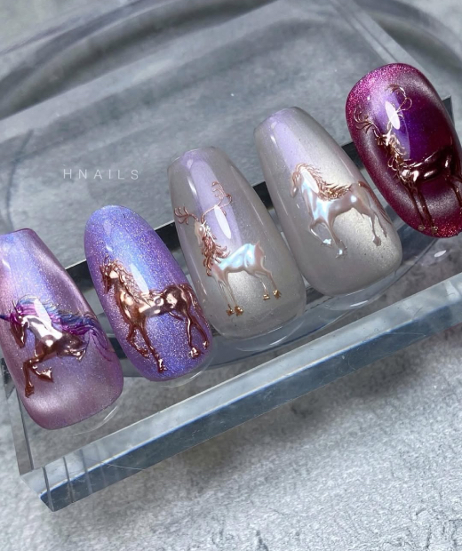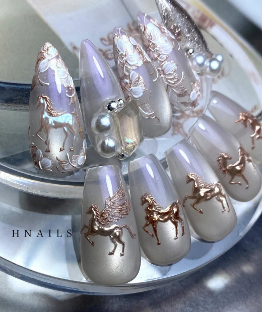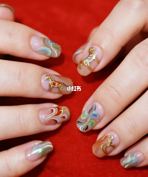 For a truly elevated take on this year’s zodiac animal, this set is perfect if you want nails that feel special and unforgettable. The soft, ethereal colours paired with metallic horse details give off such a luxe, dreamy vibe.