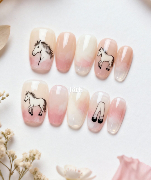 Horses may be wild and free, but they can also be gentle and graceful — just like this nail art. The soft pink base gives off a sweet, delicate vibe, while the tiny hand-drawn horse adds a whimsical, charming touch.