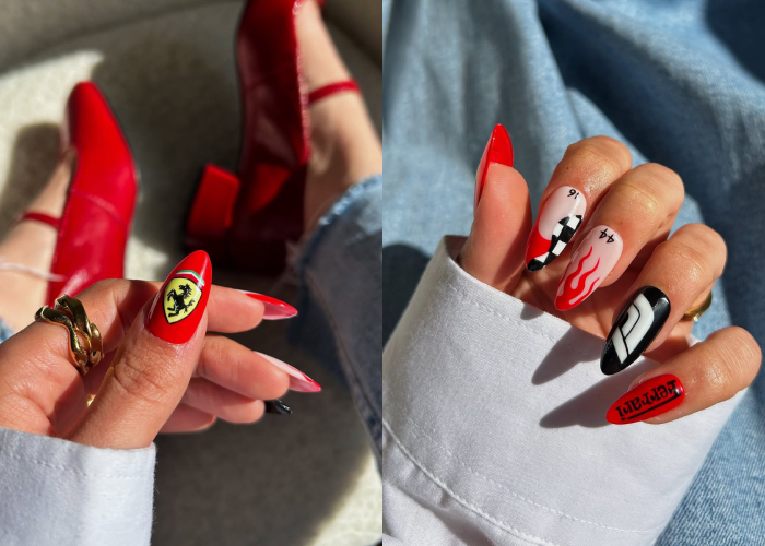 If you’re a fan of speed and style, this set is pure adrenaline. One nail rocks the Ferrari logo with the iconic horse, while the others have Formula One-inspired designs in glossy reds, blacks, and metallics.