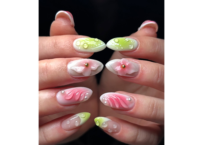 But the magic is in the details: 3D gel florals bloom across a few accent nails, paired with perfectly placed clear droplets that mimic fresh morning dew. The look is soft, dimensional, and just a little bit surreal – like catching sunlight through your favourite iced drink on a spring morning.
