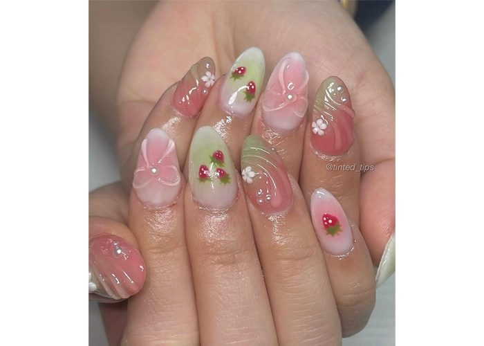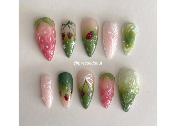 Featuring a variety of designs – from 3D strawberries and hanging vines to delicate bows, ombré gradients, and latte-like swirls – each nail tells its own sweet story while staying true to the soft pink and earthy green palette.