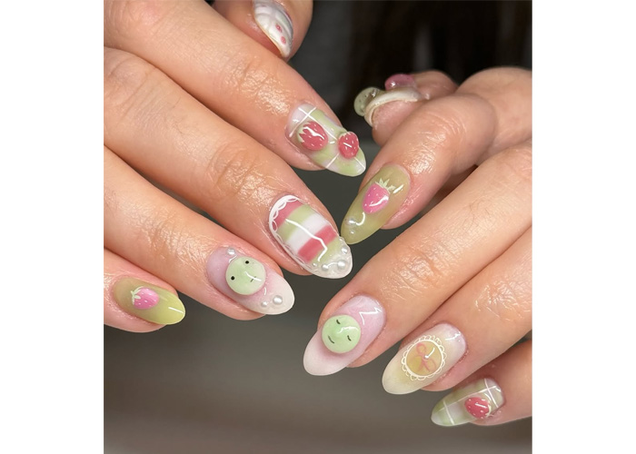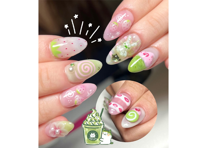 This set takes the same dreamy center ombre technique – think soft-focus matcha and strawberry clouds. With dainty hand-painted strawberries, pastel pinks and greens, tiny florals, and 3D gel ribbons (completed with teeny pearl centres), the look leans fully into the “kawaii café” aesthetic.
