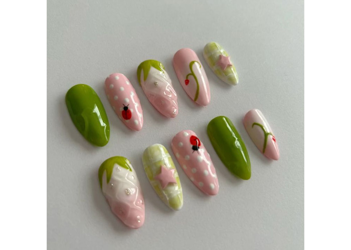 Complementing it are playful pink nails dotted with crisp white polka dots and a tiny, meticulously painted ladybug, as well as strawberries hanging off vines. A plaid green and pink nail gets a whimsical upgrade with a tiny 3D star, while solid green nails provide just enough breathing room to balance the look.