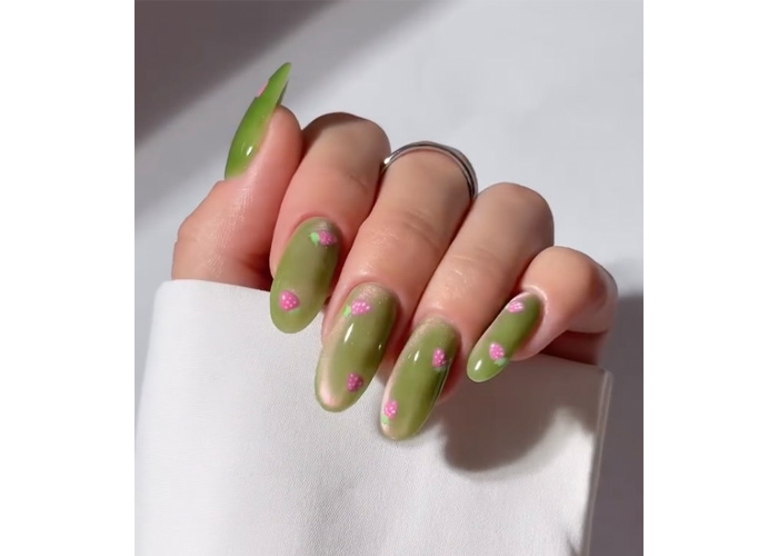 A translucent green cat eye sets the stage, but what really sells it are the minimal, barely-there strawberries that feel more like accents than a full-on print. Think “clean girl” meets “nail art nerd” – a subtle flex if there ever was one.