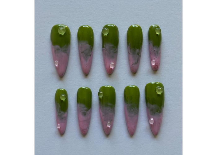 This set drips with cottagecore and balletcore elegance, turning strawberry matcha nails into a delicate dance of texture and charm. Tiny bows and lace details take centre stage, from the intricate 3D gel pleats mimicking a ballet tutu’s soft folds to a striking green nail adorned with pink laced-up corset-inspired accents.